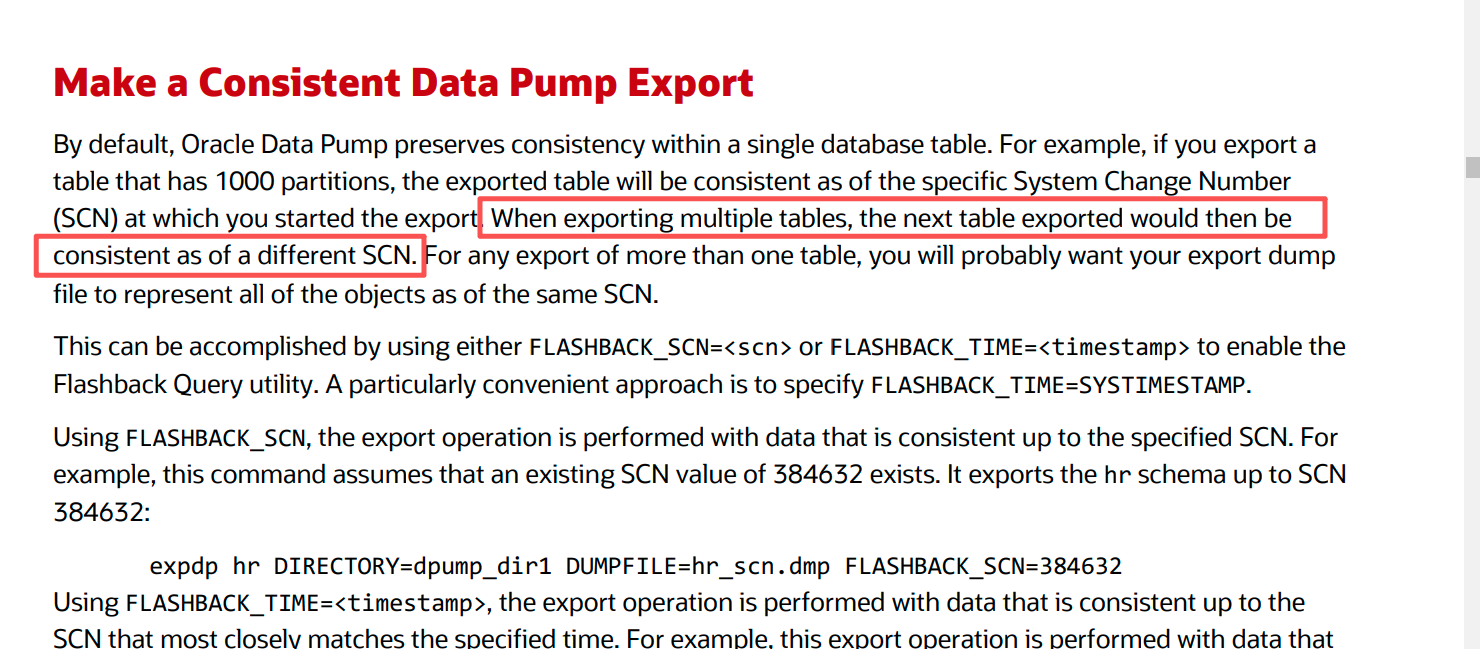 使用数据泵expdp导出多张表时,如果不加上flashback_scn或者flashback_time参数,那么会每张表导出时使用的SCN都不相同,但是每张表内部的SCN是一致的。